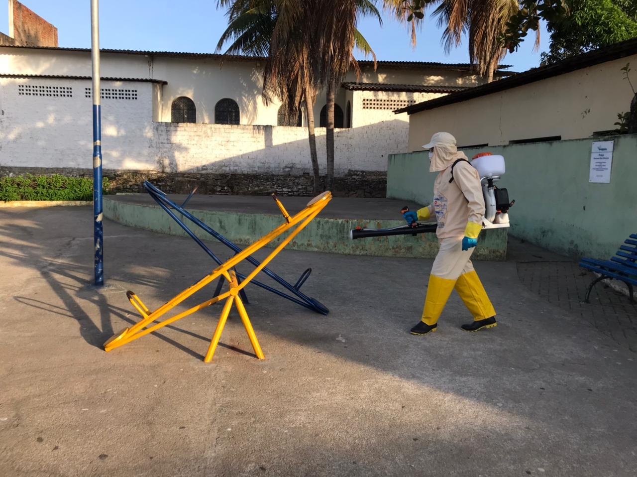 Intensificando os trabalhos de combate à proliferação da Covid-19, a prefeitura, por meio da secretaria de Saúde, realizou neste final de semana, a desinfecção de espaços de grande circulação de pessoas; prédios públicos; feira livre e frota de veículos. Durante a ação, a equipe da Vigilância Sanitária, com o apoio da Polícia Militar, seguiu com as atividades de conscientização dos moradores sobre a importância do uso da máscara e do distanciamento social.