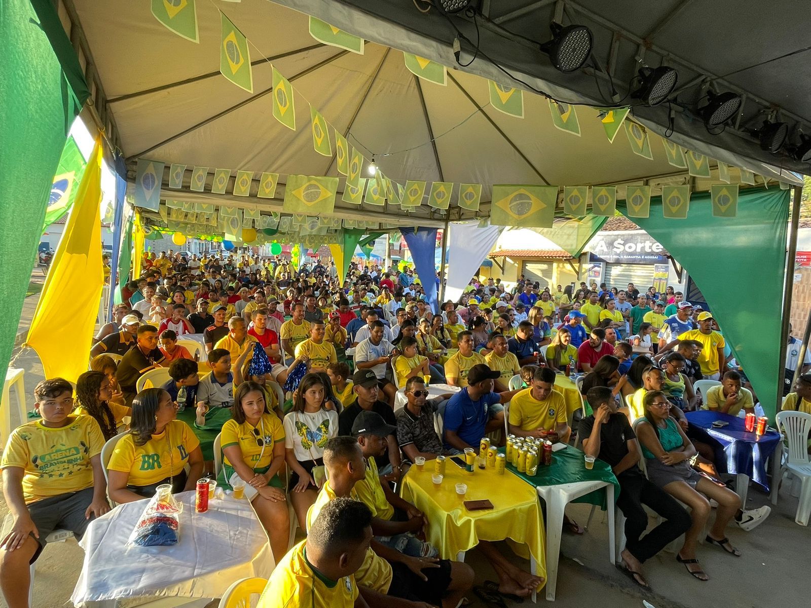 Centenas de torcedores se reuniram, nesta quinta-feira (24), na Arena do nosso município, para acompanhar a transmissão ao vivo do primeiro jogo da Seleção Brasileira na Copa do Mundo. O espaço, preparado pela Prefeitura por meio da Secretaria de Cultura, Esportes e Turismo, foi montado no centro da cidade e contou com estrutura de telão de LED, cadeiras, mesas e decoração. Além disso, no palco, o público acompanhou a apresentação de alunos da educação infantil e do DJ Luan Love; e ao fim da partida, o cantor Douglas Soares, animou a turma na comemoração da vitória do Brasil por 2 a 0 contra a Sérvia.