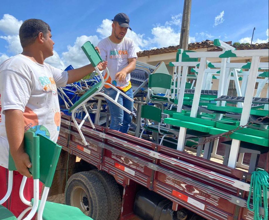 Dando continuidade aos investimentos na área da educação, a Prefeitura, adquiriu, com recursos próprios, uma nova remessa de conjuntos escolares. Compostos de carteira e cadeira, 526 kits foram distribuídos para as 17 unidades de ensino da zona urbana e rural.