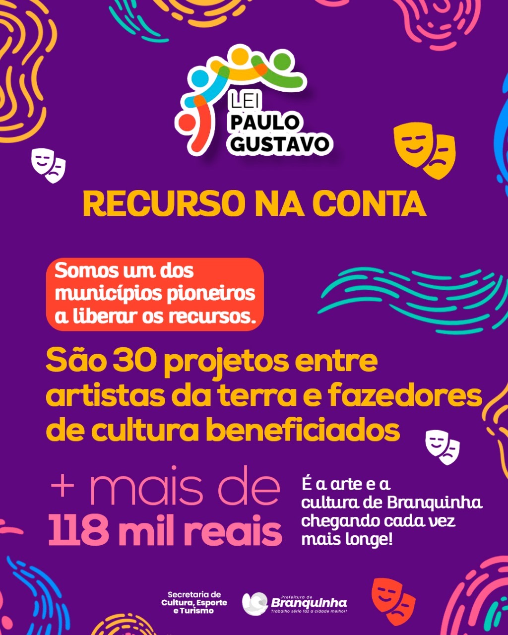 “Mesmo sancionada a lei complementar que prorroga o prazo de execução dos recursos na Lei Paulo Gustavo para ações emergenciais no setor da cultura, prejudicado pela pandemia de covid-19, para o fim de 2024, com muita organização e a devida celeridade nos processos, hoje anunciamos com alegria, que somos um dos municípios pioneiros a liberar essa verba para 30 projetos entre artistas da terra e fazedores de cultura da Branquinha”, explicou o secretário Jefferson Tenório.