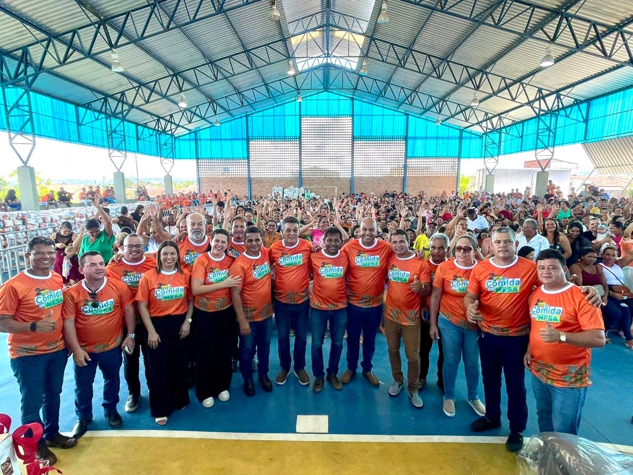 Para comemorar o segundo ano do Programa Comida na Mesa e seguindo com a programação da semana em celebração aos 62 anos de Emancipação, a Prefeitura de Branquinha, por meio da Secretaria de Assistência Social, promoveu um grande evento, nesta terça-feira (14), onde as 1.500 famílias cadastradas se reuniram para a entrega de cestas de alimentos, que neste mês, contou com a proteína de frango para complementar a refeição. Na oportunidade, os beneficiados também participaram de um sorteio, em parceria com o Instituto de Gestão de Políticas Públicas (IGPS), de itens como: mesa, armário, airfyer, geladeira, sofá, microondas, batedeira, lavadeira de roupa, TV e celular. O prefeito Neno Freitas, com a primeira-dama, Renata Freitas e a secretária Roseni Silva, destacou a alegria em promover tantos avanços para a cidade, principalmente na área social. “Durante os últimos dois anos, o Comida na Mesa distribuiu mais de 400 toneladas de alimentos e 33 mil cestas básicas garantindo segurança alimentar e mais nutrição às famílias. São 62 anos de história e, nos últimos anos, com grandes investimentos, obras e implantação de programas como o Comida na Mesa, garantimos uma melhor qualidade de vida ao povo branquinhense. Estamos muito felizes e realizados em assegurar esse importante programa, que é mantido com recursos próprios”, completou. Prestigiaram o evento, o presidente da Câmara, Robinho do Bar; os vereadores Novinho, Frank Eloi, Françuar, Dedé Melo, Fabiano, Costa e Baía; e secretários municipais.