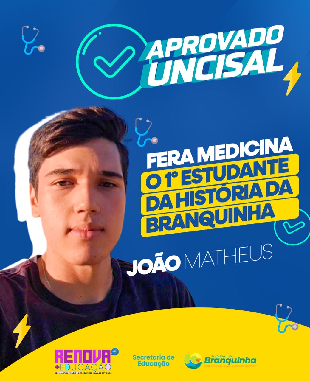 Após concluir o ensino fundamental na rede municipal de ensino de Branquinha, o jovem João Matheus, 17 anos - atualmente estudante da rede estadual, recebeu a notícia da sua aprovação no vestibular de medicina pela Uncisal. O feito inédito reforça o papel transformador da educação e serve como inspiração para outros jovens.