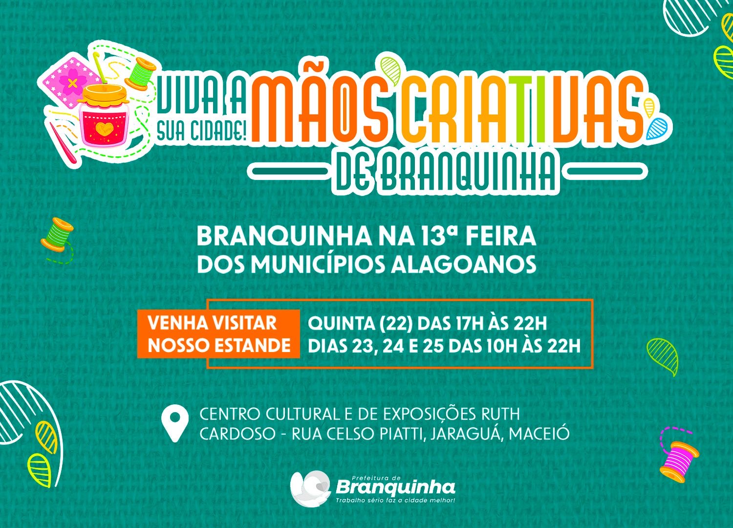 De 22 a 25 de janeiro no Centro de Convenções, em Maceió, Branquinha marca presença na 13ª Feira dos Municípios Alagoanos, promovida pela AMA - Associação dos Municípios Alagoanos. No evento que conta com uma vasta programação, dez artistas da terra participarão do estande “Mãos Criativas de Branquinha”.