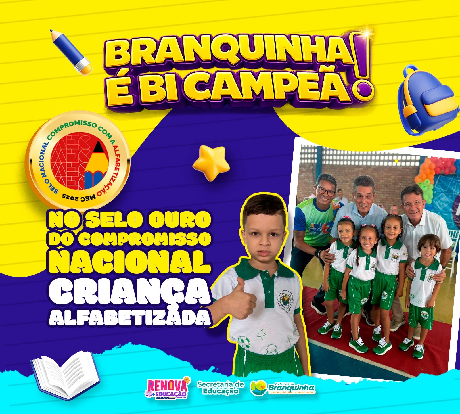 Pelo segundo ano consecutivo, a Prefeitura de Branquinha, através da Secretaria de Educação, recebeu o selo da categoria “Ouro” pelo Compromisso Nacional Criança Alfabetizada. O selo é uma forma de reconhecimento que valoriza as boas práticas em ações voltadas à alfabetização das crianças e à diminuição das desigualdades educacionais.